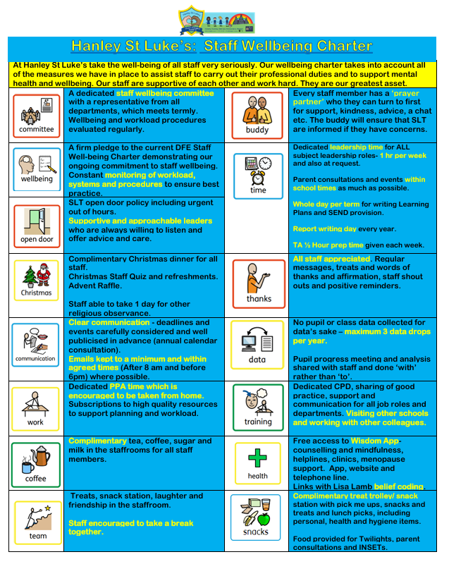 At Hanley St Luke's, we value the wellbeing of all our staff and understand that a happy, supported team creates the best environment for our children to thrive. Our Staff Wellbeing Team includes a representative from each department across the school, ensuring every voice is heard. The team meets regularly to share ideas, discuss ways to reduce workload, and develop initiatives that support a positive work–life balance. Together, we focus on creating a culture of care, collaboration, and mutual support where staff wellbeing is a shared priority.