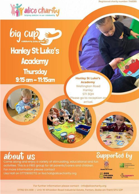 Alice Charity is a local charity based in Stoke‑on‑Trent and Newcastle‑Under‑Lyme that has been helping vulnerable and disadvantaged families since 2011. They aim to provide practical support, kindness and long‑term solutions so families and children can thrive and build strong, positive futures.